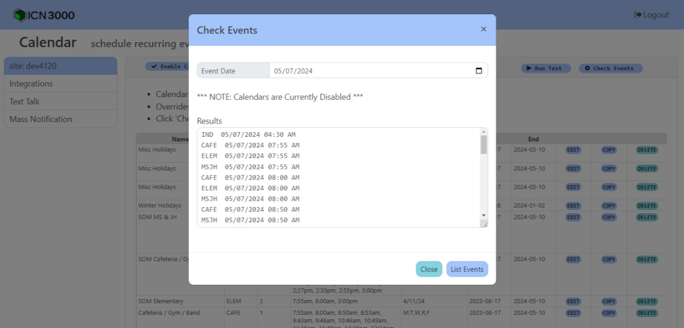 The Check Events button in the upper right corner of the Calendar page opens a dialog to list all calendar events for a give date. The events are listed in chronological order. Note that different signals will be raised at times which occur in multiple calendars.